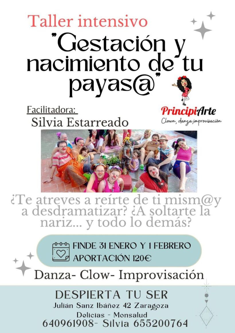 TALLER INTENSIVO INICIACIÓN PRINCIPIARTE (31 Ene-1 Feb) ZARAGOZA Os animo a descubrir el Estado Clown una vía de meditación en movimiento y desde la catarsis a la que lleva el juego y la conexión con nuestras potencialidades a través de la expresión de nuestr@s payas@s. La metodología PrincipiArte, facilita un camino para salir de […]